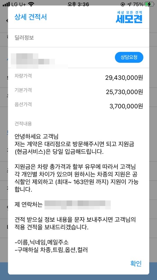 이렇게 견적을 받았다면 딜러 분하고 문자를 먼저 하고 전화 통화를 한 다음에